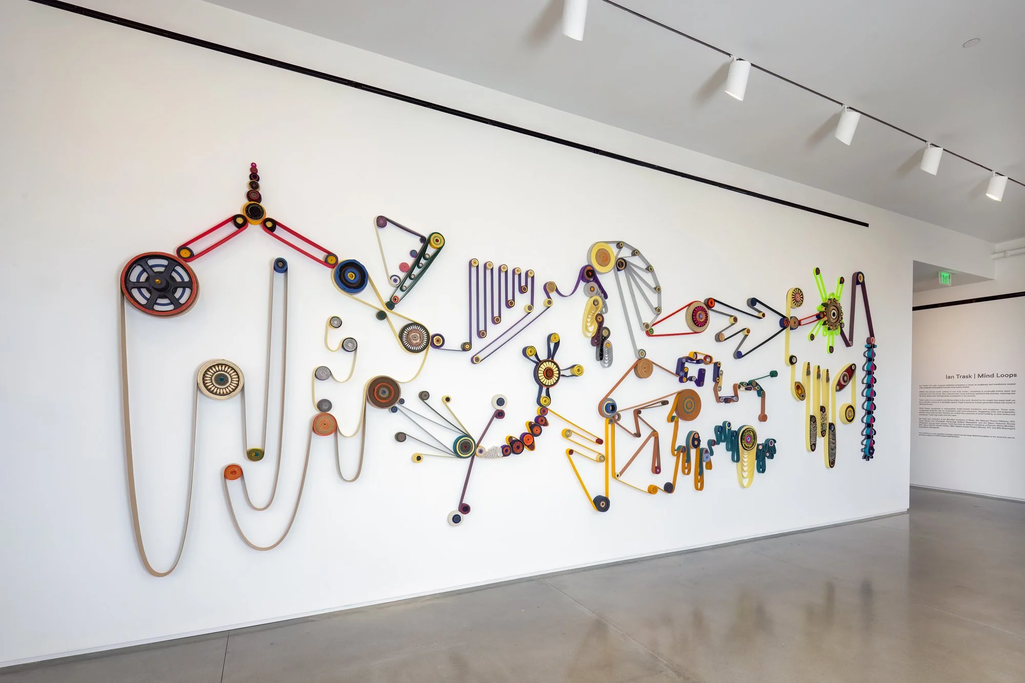 In 2022 I created an ephemeral 30’ textile mural titled “Cosmic Thread” on the entry wall at the Center For Maine Contemporary Art in Rockland, Maine as part of my first solo museum exhibition Mind Loops. Over the course of 5 days I improvised the piece on-site using an assortment of materials, including multicolored elastic belts, textile trimmings, and 35mm slide carousels. I’ve been making this style of temporary installation since 2009, when I first encountered a treasure trove of textile materials in the basement of the Invisible Dog Art Center in Brooklyn, NY. The belts and trimmings were among the many materials produced in the building during its past life as a factory space. Throughout the years, I‘ve been reusing these same materials to create my pieces, recombining and reinventing them to form novel compositions.
